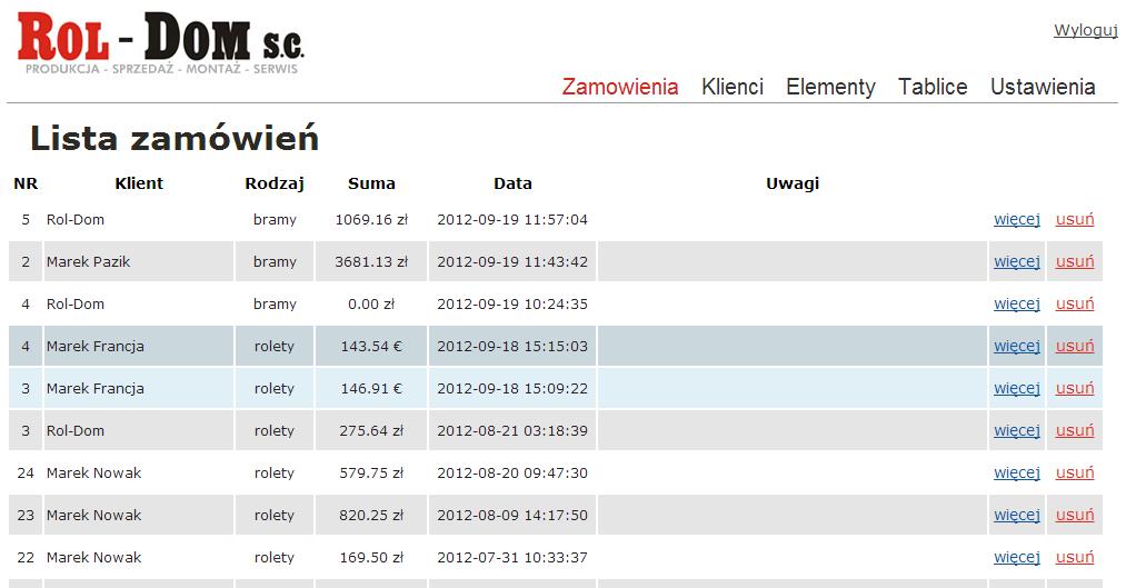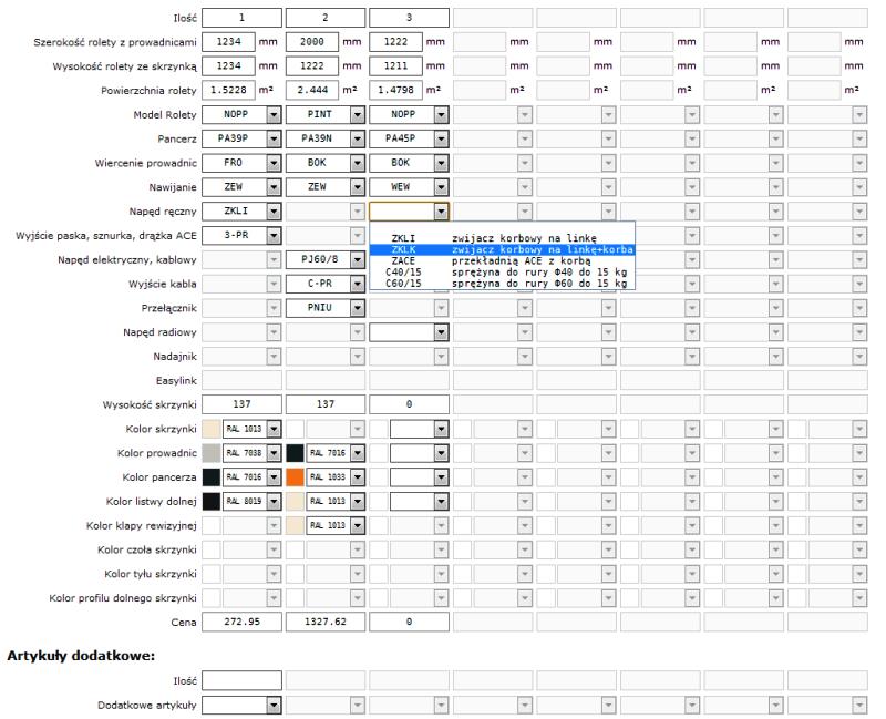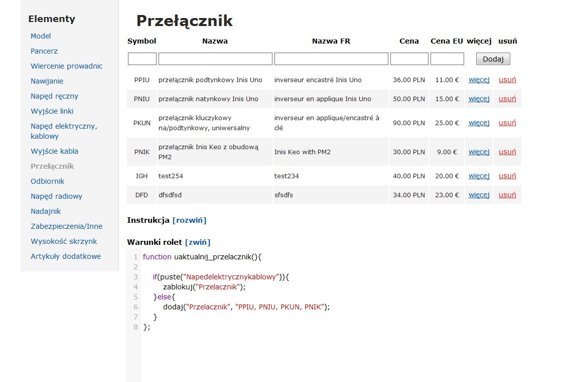 Pierwsza moja komercyjna aplikacja. Największym problemem było wyświetlanie poszczególnych komponentów do wyboru, np. w zależności od modelu rolety, pancerza i szerokości, mogły być aktywne wybrane napędy, jeżeli klient wybrał napęd ręczny, to nie mógł już dla danej rolety wybrać napędu elektrycznego itd. Ponadto te zależności między komponentami były dosyć skomplikowane i musiały być proste w edycji.