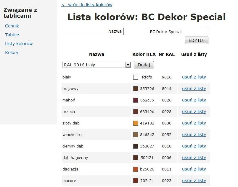 - Strona gdzie można dodawać schematy kolorów bram i ustalać dla nich ceny
